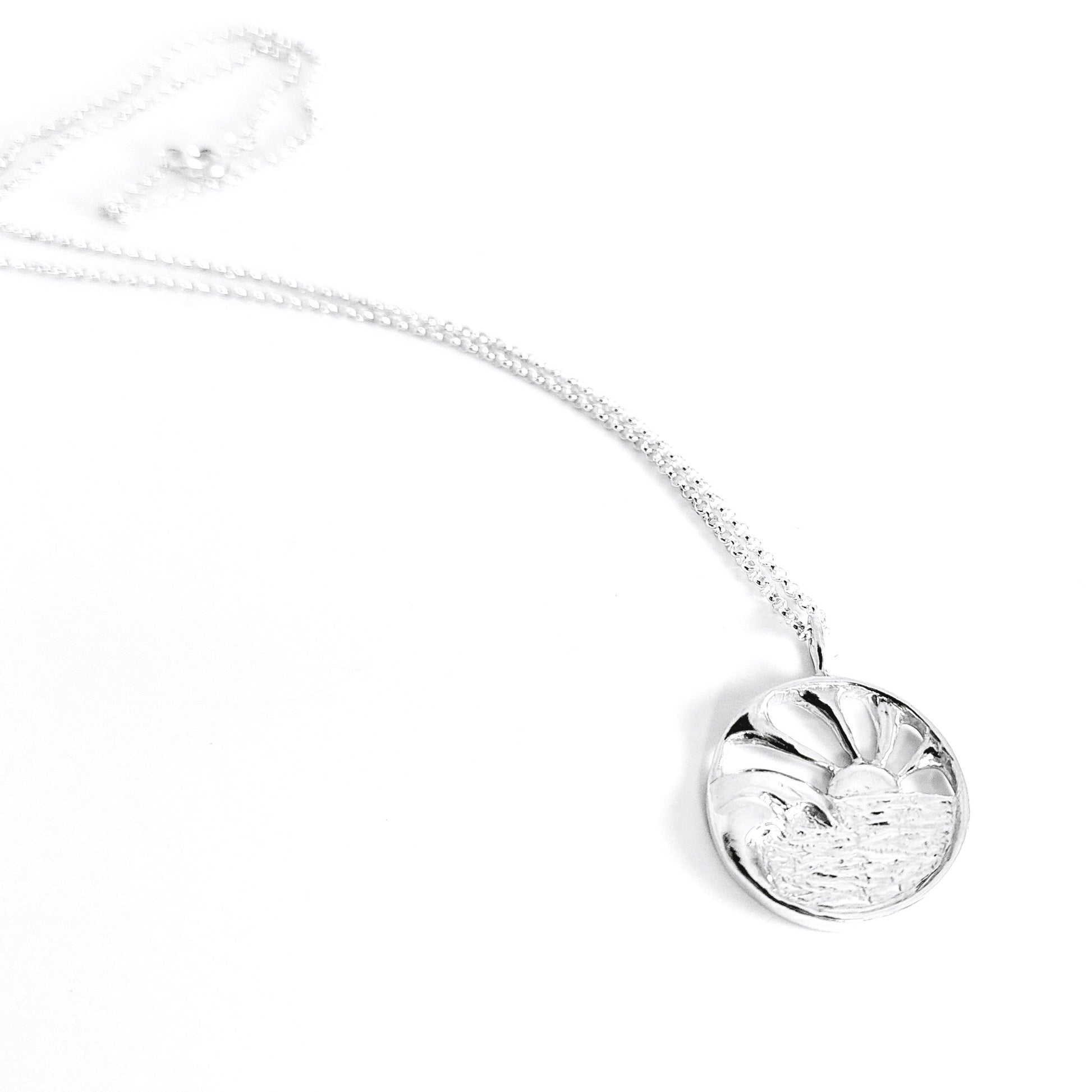 Awaken your spirit with the Blue Dawn Pendant, a handcrafted piece that captures the essence of renewal and inspiration. Sculpted from wax and expertly cast in 925 sterling silver, this exquisite pendant depicts the sun rising over the ocean, a timeless symbol of new beginnings, fresh perspectives, and endless possibilities.